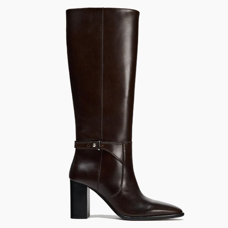 Este modelo de Zara es ideal para aquellas personas que quieren sumarse al furor por las botas altas pero les cuesta encontrar diseños con la caña algo más ancha. Asimismo, cuentan con una hebilla lateral y tacón bloque de 8 centímetros. Precio: 109 euros.