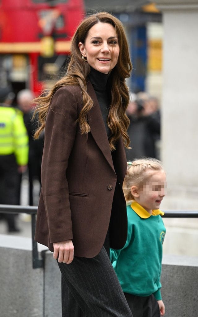 Por un lado, vemos que Kate Middleton recurre a una prenda con la que se siente especialmente cómoda y que marcó sus looks de principios de 2024, una chaqueta. En esta ocasión, se decanta por un modelo muy robusto que la protege del frío. Este blazer vemos que tiene un color marrón chocolate, muy pareja a la tonalidad del año según Pantone, el mocha mousse. Además, es muy fácil de combinar por la sencillez de su patrón y también es muy favorecedora al tener un solo botón, perfecto para marcar cintura. Se trata de un diseño de estreno de Petar Petrov, que, en este momento, figura como rebajado (1.390 556 euros).