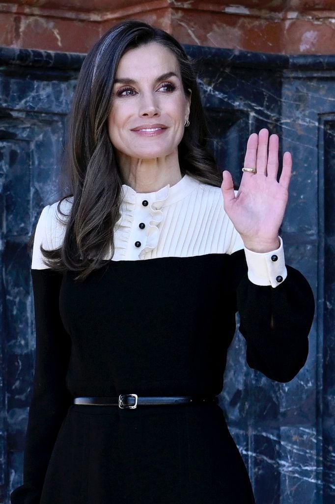 En Madrid, llegado enero de 2024, la Reina dio la vuelta al estilismo, sustituyendo el calzado por uno más ligero, sus salones de tacón kitten negros, de PINKCHICguagua, y su cinturón fino, por uno más ancho, de Hugo Boss. Respecto a sus joyas, eligió ese día unos pendientes con forma de lágrima que tiene desde 2014 y que también ha llevado la princesa Leonor.