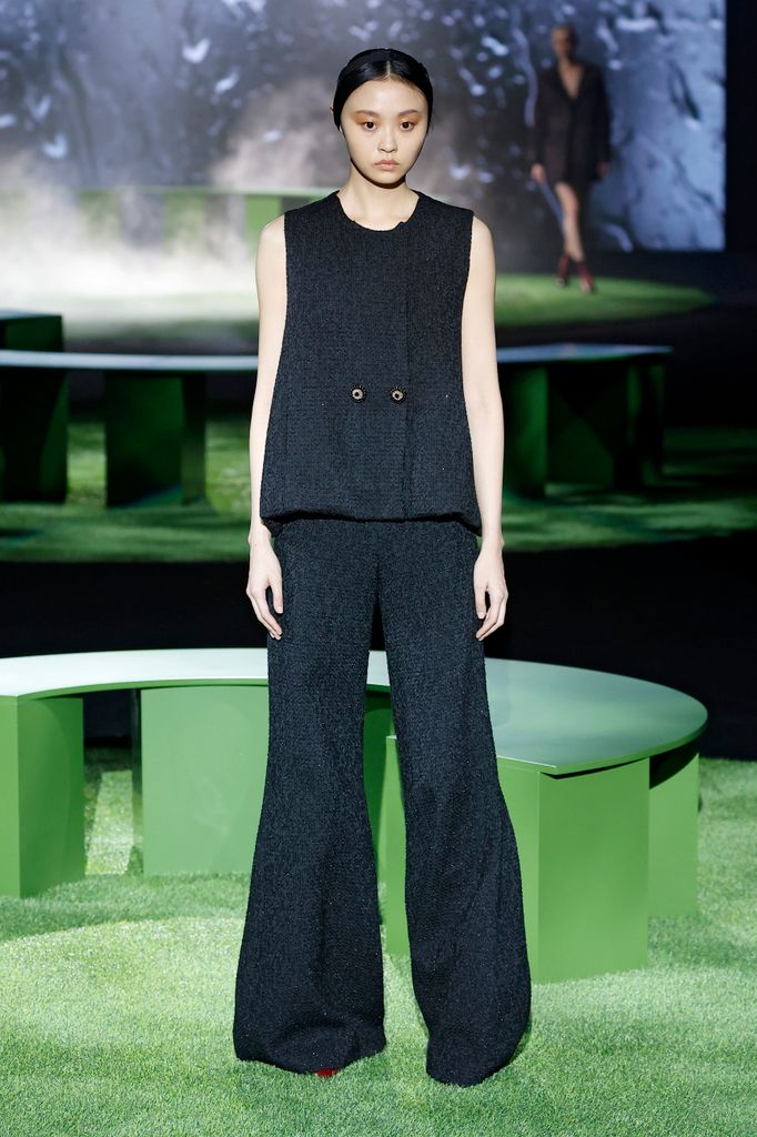 Con el objetivo sostenible de crear prendas que sirvan para llevar “no solo hoy, sino también en el mañana”, Fely Campo nos presenta unas propuestas con tejidos enriquecidos con acabados brillantes y, como estampado, un seductor print de pata de gallo XXL. Sobre la pasarela, vemos vestidos que se despegan ligeramente de la figura, que juegan con diferentes tipos de escote y que se muestran tanto en largo midi como mini. En este último caso, se combinan con abrigos extralargos. También vemos trajes, de anchos pantalones y chaquetas cortas en líneas trapecio, perfectos para sorprender en las citas más especiales.
