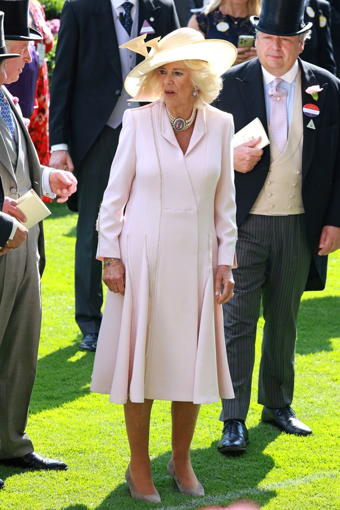 También Camilla, y más desde que es reina, nos ha dejado grandes looks para el recuerdo. El 21 de junio de 2023, recuperó abrigo-vestido de Anna Valentine, con cuello camisero, manga larga, corte a la cintura y falda evasé. Es el mismo que llevó en la boda del príncipe Harry y Meghan Markle el 19 de mayo de 2018. En su primer Ascot tras la coronación del rey Carlos III, lo contrastó con una pamela de rafia en tono natural y decorada con un lazo abstracto, de Philip Treacy. Llamó también la atención su gran choker de cinco filas de perlas y gran broche de la época eduardiana realzado con gran topacio rosa.