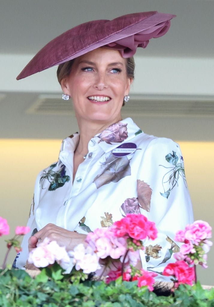 Otra invitada de los Windsor que causa sensación año tras año, es la actual duquesa de Edimburgo. El 20 de junio de 2024, Sophie estrenó un vestido camisero con estampado floral sobre fondo blanco, el modelo Trixie de Suzannah. Lo combinó con un llamativo tocado de Jane Taylor y nuevos pendientes de diamantes y perlas en forma de rosa de Garrard.