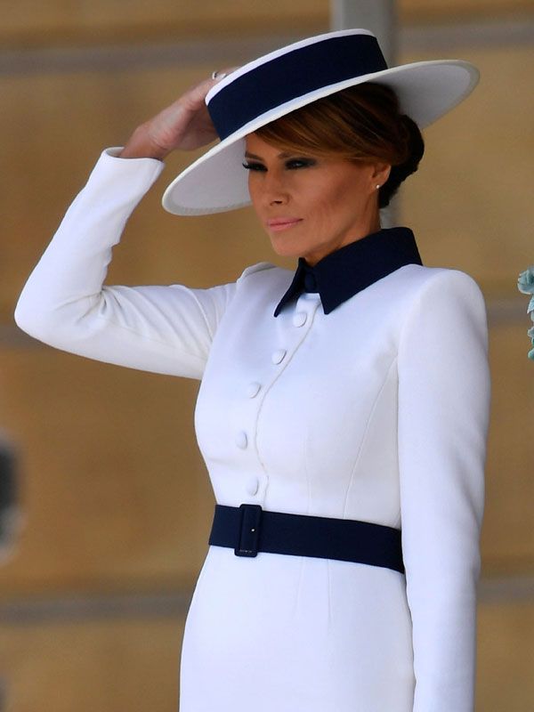 Gracias al cinturón, al cuello en contraste y a los botones del pecho, a primera vista el vestido podía parecer un traje de chaqueta y falda combinado con una camisa oscura, especialmente porque una de las últimas tendencias es llevar la americana por dentro de la prenda inferior. Además, el cinturón oscuro sobre la ropa clara ayuda a afinar visualmente la figura y a dibujar curvas, consiguiendo que Melania estuviera muy favorecida con el diseño italiano. Lo ha combinado con unos altísimos stilettos azules y una pieza poco habitual en ella: un sombrero, un accesorio que incorpora exclusivamente en ocasiones puntuales, como su encuentro con Brigitte Macron en abril de 2018, cuando también triunfó vestida de blanco.