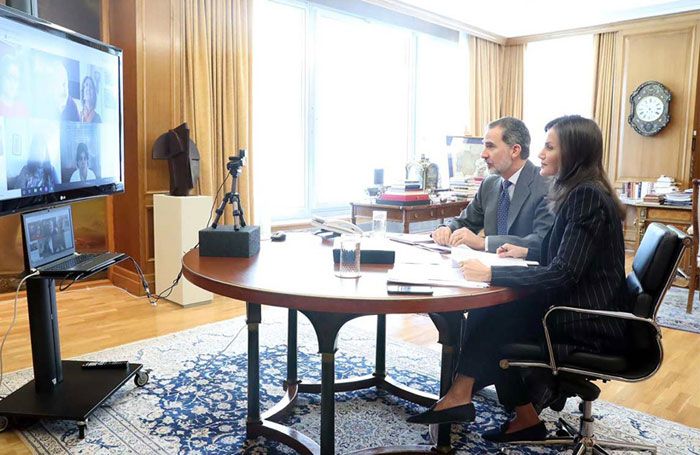 Este look que marca la diferencia con elecciones previas tiene como pieza central un traje en tono oscuro con raya diplomática. Una prenda con potente efecto estilizador en cintura y hombros que sale de Palacio, pues la estrenó durante una videoconferencia a finales de mayo con los equipos directivos del Comité Español de Representantes de Personas con Discapacidad (CERMI), encabezados por su presidente, Luis Cayo y con Cáritas, entre otros organismos. Al menos, llevó la chaqueta, pues aparece sentada. De ahí, que el pantalón pasara más desapercibido. De hecho, visualmente se genera un misterio, pues parece que hace 7 meses prefirió combinar su blazer con unos modelo en tono liso que dejaba al descubierto sus tobillos. Completó su estilismo con top blanco, básico y ajustado, y zapato plano.