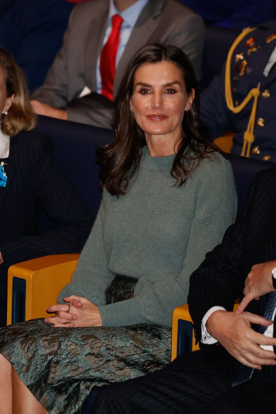 La Reina ha visitado el Palacio Municipal de Congresos de Madrid (IFEMA) para dar por finalizada la décima edición de esta iniciativa organizada por la CEOE, cuyo objetivo es que más mujeres participen en puestos de responsabilidad en las empresas. Para la ocasión, ha optado por reciclar un look de la firma española Is Coming, fundada por Constan Hernández a finales de 2019. Está compuesto por un jersey de lana en tono verde agua con mangas tipo globo y una preciosa falda tubo de tiro alto confeccionada con untejido brocado de flores en tonalidades verdosas.