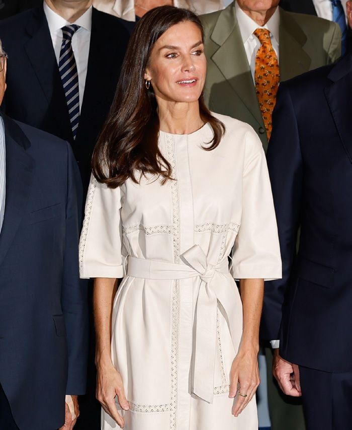 Para estar cita institucional celebrada en Madrid, doña Letizia ha querido recuperar uno de sus vestidos que tiene bajo el sello de la firma española Massimo Dutti. De esta marca de Inditex, en total tiene 11 modelos diferentes, de los cuales, hoy, recicla uno confeccionado en napa de color blanco, que tiene un corte tipo kimono, cinturón al tono para marcar la figura y delicados detalles de puntillas.