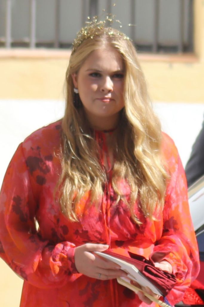 Las invitadas de Victoria de Hohenlohe y Maxime Corneille ya daban una pista de la elegancia de la que seríamos testigos a la entrada de la Iglesia de San Miguel durante la fiesta de preboda, celebrada el día anterior en el palacio de Campo Real. Allí pudimos ver a la princesa Miriam al-Ghazi de Jordania, a Paloma Segrelles, a la reina Máxima de los Países Bajos y también a su hija, la princesa Amalia, quien no dudó en rendirle un bonito homenaje a nuestro país a través de un estilismo de marcado acento flamenco. La hija de los Reyes de los Países Bajos ha mantenido el rojo de la flor con la que adornó su moño al día siguiente, aunque esta vez ha sido el protagonista de un vestido de silueta ceñida en la cintura y falda vaporosa que le sentaba especialmente bien. Aunque el detalle realmente especial de su estilismo ha recaído en el tocado: una delicada pieza dorada de diseño realmente mágico.