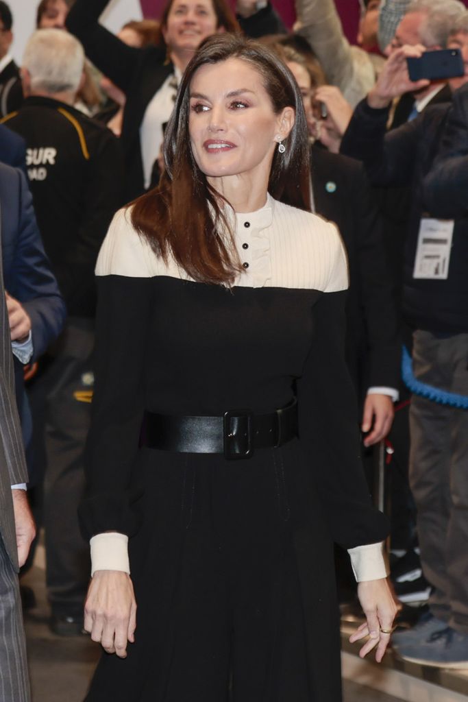 Para esta 44ª edición de la Feria de Turismo Internacional de Turismo-FITUR, doña Letizia ha querido abrir su armario y recuperar una prenda que causó sensación en el día de su estreno. En concreto, ha reciclado un mono de estilo victoriano en color negro y blanco que llama la atención por sus volantitos abotonados en el escote y su pantalón muy ancho en corte culotte. Este diseño de la diseñadora catalana Teresa Helbig lo lució por primera vez (y única hasta la fecha) el 17 de noviembre de 2022 durante su visita oficial a Croacia.