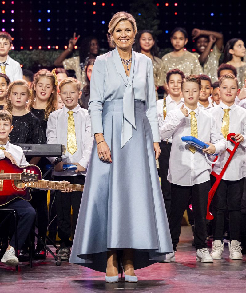 Para acudir al concierto previo al Día del Rey, celebración que el próximo sábado también tendrá lugar en Emmen, Máxima de Países Bajos quiso que los colores tuvieran especial protagonismo en su look, pues buscó una combinación cromática muy atractiva visualmente y que le sentaba de maravilla. Por un lado, ha reciclado una falda de shantung de seda en color azul muy claro que tiene línea trapecio, cintura muy marcada y bajo asimétrico, siendo más corto por delante. Esta prenda de Natan Couture (modelo Nemo) la estrenó el 14 de diciembre de 2023 durante la Christmas Music Gala, que, posteriormente, se retransmitiría por televisión. Aquel día la Reina la combinó con una blusa con lazada a juego, evitando cualquier contraste de tonalidades.