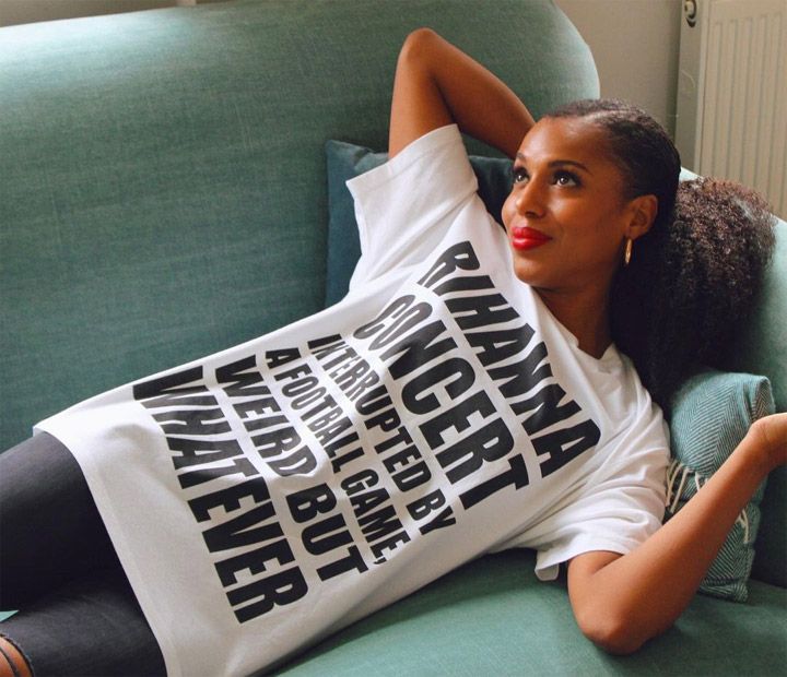 La modelo británica es amiga íntima de la cantante, habiendo desfilado incluso en la última puesta en escena de su línea de lencería Savage x Fenty, así que no teníamos dudas de que iba a hacer acto de presencia en Arizona para darle unas cuantas palabras de aliento. Lo que no esperábamos es que, en lugar de llevar el uniforme de su equipo predilecto, se puso esta camiseta gráfica con el texto:"Concierto de Rihanna interrumpido por un partido de fútbol, raro pero vale".