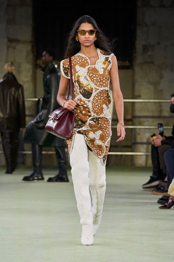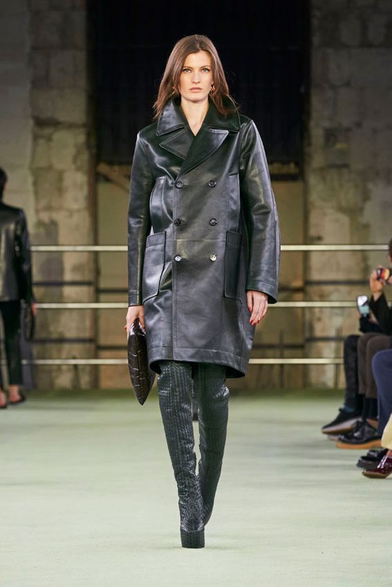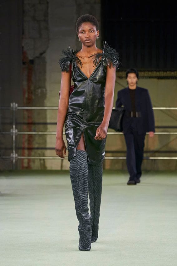 No podemos hablar de Bottega Veneta sin mencionar sus reconocidos accesorios como en este caso bolsos y botas elaborados con la técnica del intrecciato, a base de entrecruzar tiras de cuero y que supone el ADN principal de la firma junto con los zapatos extravagantes de plataforma XXL. Una colección atemporal que a través de prendas y conjuntos elegantes nos demuestra que la moda es pasajera pero el estilo permanece.