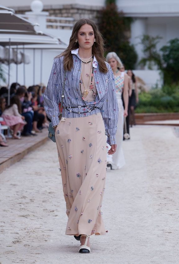 Una vez más, la diseñadora Virginie Viard se mantiene fiel a los códigos que han cosolidado a la casa de Chanel con su propuesta para la temporada Crucero 2022-2023, ambientada e inspirada en el lujoso Principado de Mónaco, sede de La Vigie, villa refugio del fallecido director creativo Karl Lagerfeld. Es también el hogar de Carolina de Mónaco y Carlota Casiraghi, ambas musas eternas de la firma que han estado presentes en el desfile homenaje a su tierra natal; una presentación que tuvo lugar en la paradisíaca playa del Hotel Monte-Carlo Beach. Destacan los monos de piloto confeccionados con tweed estampado o seda, en referencia al popular Circuito de Montecarlo; trajes con bermudas cuajados de lentejuelas o pedrería; camisetas estampadas y unos románticos vestidos semitransparentes que nos hacen desear la llegada oficial del verano. Y como complemento, una gorra para dar un giro muy casual y chic a cada look.