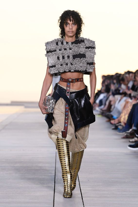 Desglosa el vestir contemporáneo como nunca antes, con sus hombreras XXXL (apenas ponibles), armaduras metálicas, zapatillas aerodinámicas, trajes de jet ski y la favorecedora silueta péplum, ahora conducida al extremo. Los accesorios, aunque suelen pasar desapercibidos, no se quedan atrás en esta oportunidad. Ghesquière reimagina los maletines históricos de Louis Vuitton, que datan de hace 150 años, con incrustaciones de espejos que se encuentran con el sol tras los pasos de las modelos en la desértica estructura.