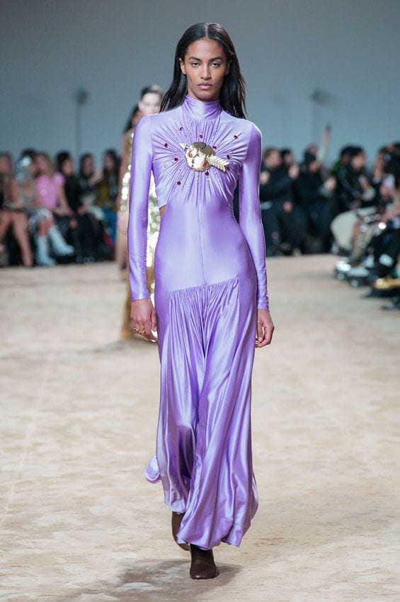 Por cliché que parezca, no existiría homenaje sin sus grandes éxitos: reproducciones del bolso Iconic 1969, fabulosos trajes de lamé con aplicaciones de pedrería, armaduras al estilo de una guerrera romana... Todo ello haciendo eco del sello Paco Rabanne en su presente, capitaneado por Dossena. Bajo su mando desde hace diez años, se ha distanciado de aquella estética futuristapara reivindicar a la it girl parisina de los años glamourosos años 70, una categoría en la que encontramos a Jane Birkin o Françoise Hardy. Con sus minivestidos de lentejuelas, lenceros de flores y trajes acampanados de terciopelo acompañados con deportivas, el director creativo ha sabido reinventar y adaptar al presente el legado de Paco Rabanne.