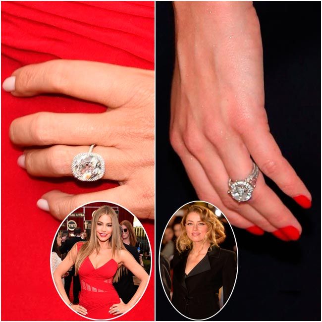 “Esta es la mano del amor”, expresó Sofía Vergara mientras exhibía sobre la alfombra roja de los premios SAG un flamante anillo en tamaño XXL. Para pedir su mano, Joe Manganiello se decantaría por una pieza compuesta por un gran diamante oval central, rodeado, a su vez, de pequeños micro-diamantes. Se especula que esta joya estaría valorada en unos quinientos mil dólares. También ovalado sería el diamante que luciría la actriz Amber Heard en su mano izquierda, una pieza de unos cinco quilates en la que Johnny Depp podría haber invertido unos cien mil dólares.