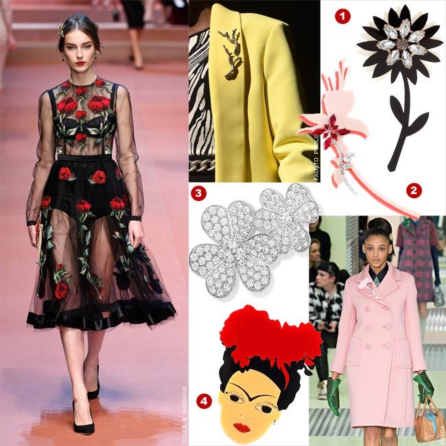Si la tendencia granny —recién salida del armario de nuestras abuelas— se impone esta temporada, ¿cómo no íbamos a desempolvar los broches del baúl de los recuerdos? Al igual que collares y pendientes iluminan el rostro, los broches coronan las solapas de los trajes e incluso las cabelleras para dar un giro radical y destellante a nuestro look. Así lo vimos al menos en propuestas como las de Prada, Fausto Puglisi o Dolce & Gabbana. Nosotros te proponemos: 1. Broche flor con cristales, de Accessorize (12,90 €); 2. Modelo floral, de Prada (590 €); 3. Broche con diamantes, de Van Cleef & Arpels (C.P.V.); 4. Original Frida Kahlo, de Patricia Nicolás (68 €).