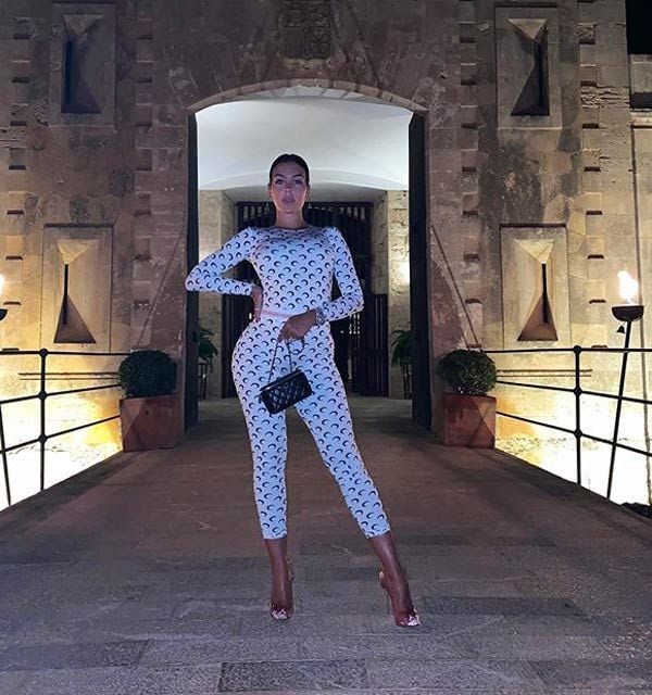 Georgina, que lleva varias semanas disfrutando de las vacaciones a bordo de un exclusivo yate por el Mediterráneo, ha desembarcado ahora en Palma de Mallorca, tal y como hemos podido comprobar gracias a la última fotografía que ha subido. En ella, posa frente a un histórico edificio de la isla enfundada en un entallado conjunto con efecto 'segunda piel' que a primera vista puede parecer un mono, pero realmente se trata de dos piezas separadas. Combina top ajustado de cuello a la caja y manga larga con leggins a media pierna confeccionados en el mismo tejido blanco decorado con estampado de pequeñas medias lunas. Lo combina con minibolso acolchado de Chanel y stilettos de PVC firmados por la marca Lesilla.