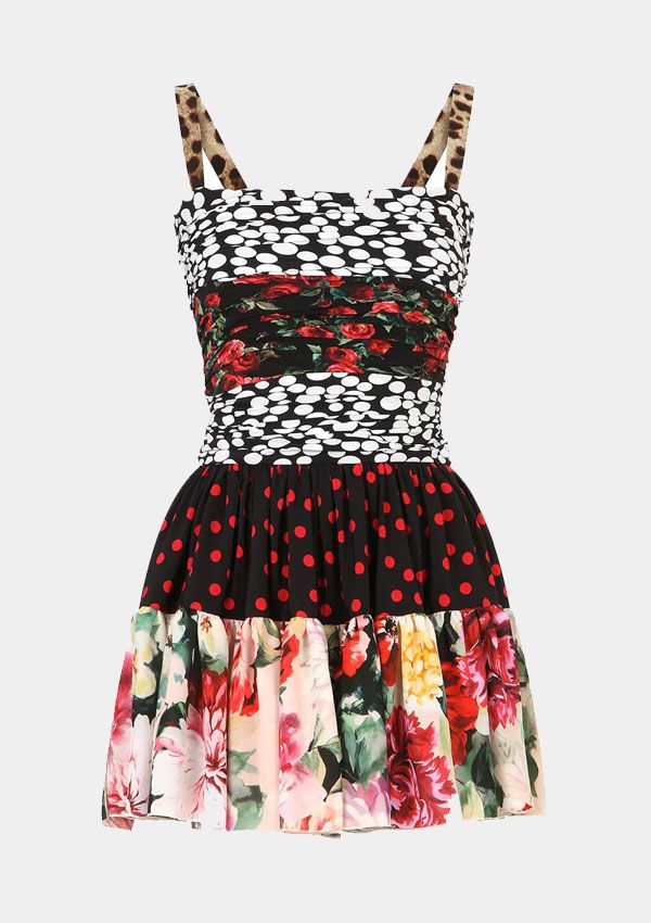 Patricia Field, estilista de la serie, ha elegido para Lily Collins este vestido corto de frunces con diseño patchwork, firmado por Dolce & Gabbana, que combina los estampados más populares de la temporada: las flores, el animal print y los lunares en diferentes versiones. El diseño pertenece a su colección Primavera/Verano 2021, que busca celebrar la labor artesanal y la variedad de estilos.