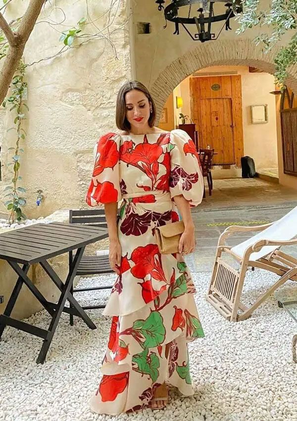 Un año antes, en el verano de 2020, Tamara Falcó ya repitió su título como invitada más elegante con otra inolvidable elección de Johanna Ortiz. En la boda de Tita Astolfi y Fernando Mora-Figueroa, la marquesa de Griñón fascinó con una elección también floral y con detalles de volantes, pero que se acompaña de un gran volumen en las mangas que no dejó a nadie indiferente.