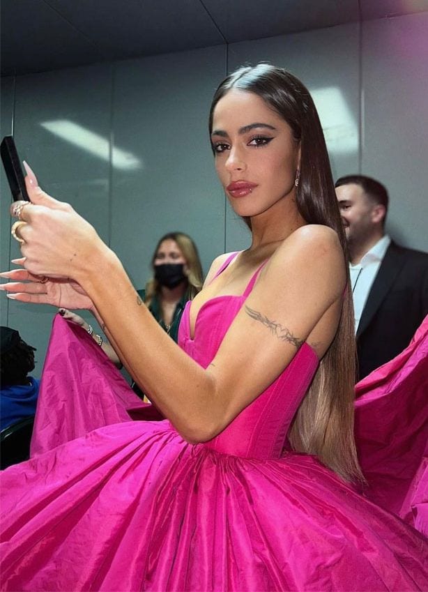 Al ritmo de la canción Carne y hueso, Tini desfiló por el escenario repleto de luces con un vestido de alta costura diseñado por el extremeño Jorge Redondo, uno de los diseñadores preferidos por las influencers y celebridades españolas. La creación de corpiño ajustado, escote corazón y faldón de volantes asimétrico está confeccionada con tafetán rosa en tonalidades fucsia y fresa.