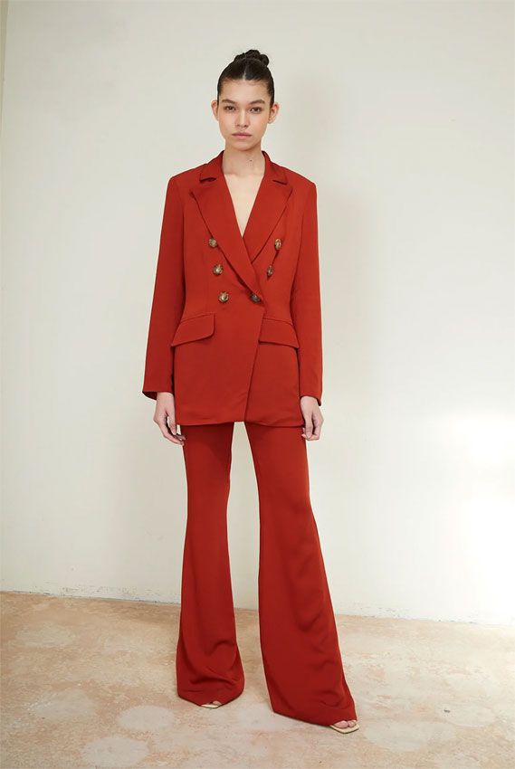 Este dos piezas tiene como protagonista esta blazer de corte entallado con mangas largas, hombros marcados, solapa en gran formato, bolsillos frontales y un cierre delantero cruzado con botones marrones. A juego, luce un pantalón de tiro alto acampanado, confeccionado en tejido de viscosa color teja. El llamado Total Look Misouri Teja no se vende por separado y su precio total es de 379,90 euros.