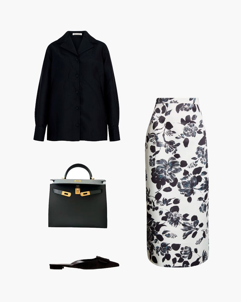 Hablamos de Emilia Wickstead, un nombre recurrente en el vestidor de la mismísima princesa de Gales y de la princesa Olympia de Grecia, quien también reside en Londres y, por si fuera poco, llegó a desfilar para la diseñadora en 2022. El elegido por Amparo es un conjunto compuesto por una blusa satinada de color negro con mangas largas abullonadas (1.274 euros) y una falda midi con estampado de flores negras que parecen pintadas a mano sobre un fondo blanco (1.050 euros).