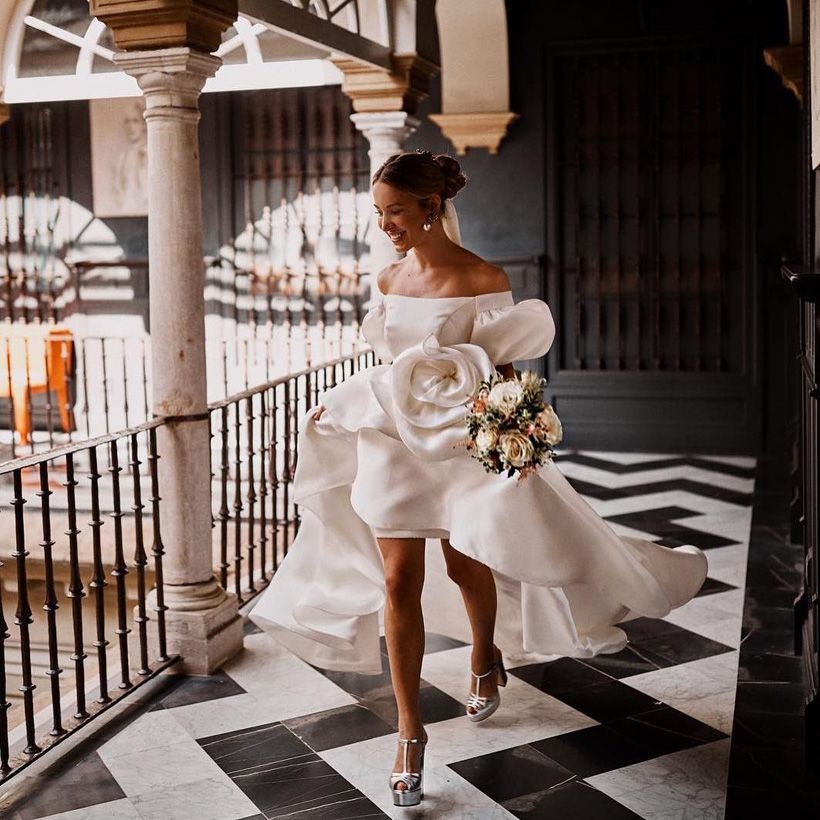 Como asegura, "no quería nada típico ni aburrido, así que trabajé con Viero Bridal para crear algo desde cero. Quería un diseño que comunicara mi personalidad atrevida y clásica al mismo tiempo. Añadí una rosa a la falda desmontable porque estas flores siempre me recuerdan a la ardiente cultura española". Se trata de un diseño con un favorecedor escote Bardot, mangas abullonadas y una cintura marcada de la que nace este enorme detalle en volumen. Además, tiene la peculiaridad de llevar una falda asimétrica que permite lucir piernas, opción que se está poniendo de moda entre las novias más originales, y es tan delicada que incorpora una suerte de capas que juegan a confundirse con los pétalos de la propia flor.