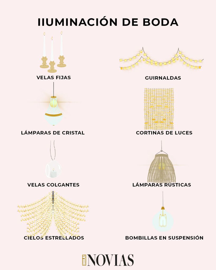Ya sea de día o de noche, la iluminación de una boda hace mucho más que aportar luz al entorno. Cada uno de esos elementos que los novios eligen, para construir, decorar y completar el ambiente, lanza un mensaje diferente y dice mucho de la visión estética de quien los selecciona. "Cambiamos espacios, les dotamos de esa personalidad que los novios quieren darle, es sin duda un elemento de diferenciación, una forma de decir 'mi boda no es una más' ", contaba Luis Lozano, director de Luces de cuento a ¡HOLA! Novias, acerca del poder de una buena iluminación. En este sentido, existen tantas opciones a elegir como tipos de pareja y en nuestra guía ilustrada te los mostramos todos.