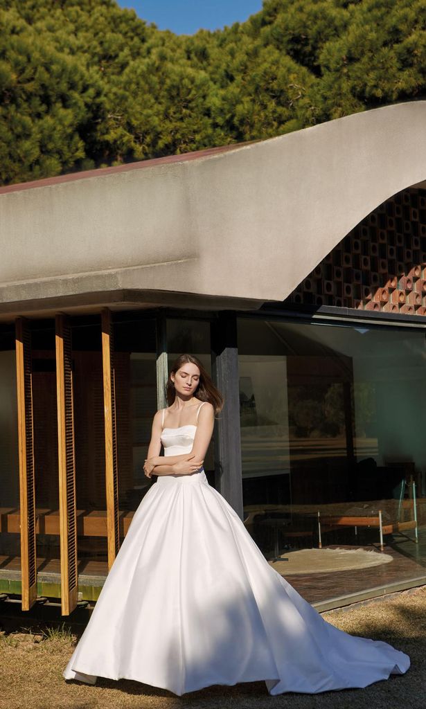 Faldas de grandes volúmenes conviven con cuerpos minimalistas, creando diseños que respiran frescura y armonía. En la imagen, la ‘top’ posa con vestido de satén, con cuerpo lencero de tirantes y lazo en la cintura y falda acampanada con cola, de Jesus Peiro. El broche final lo ponen las joyas: pendientes y anillo de platino, con diamantes cruzados baguette, de Marc Monzó.