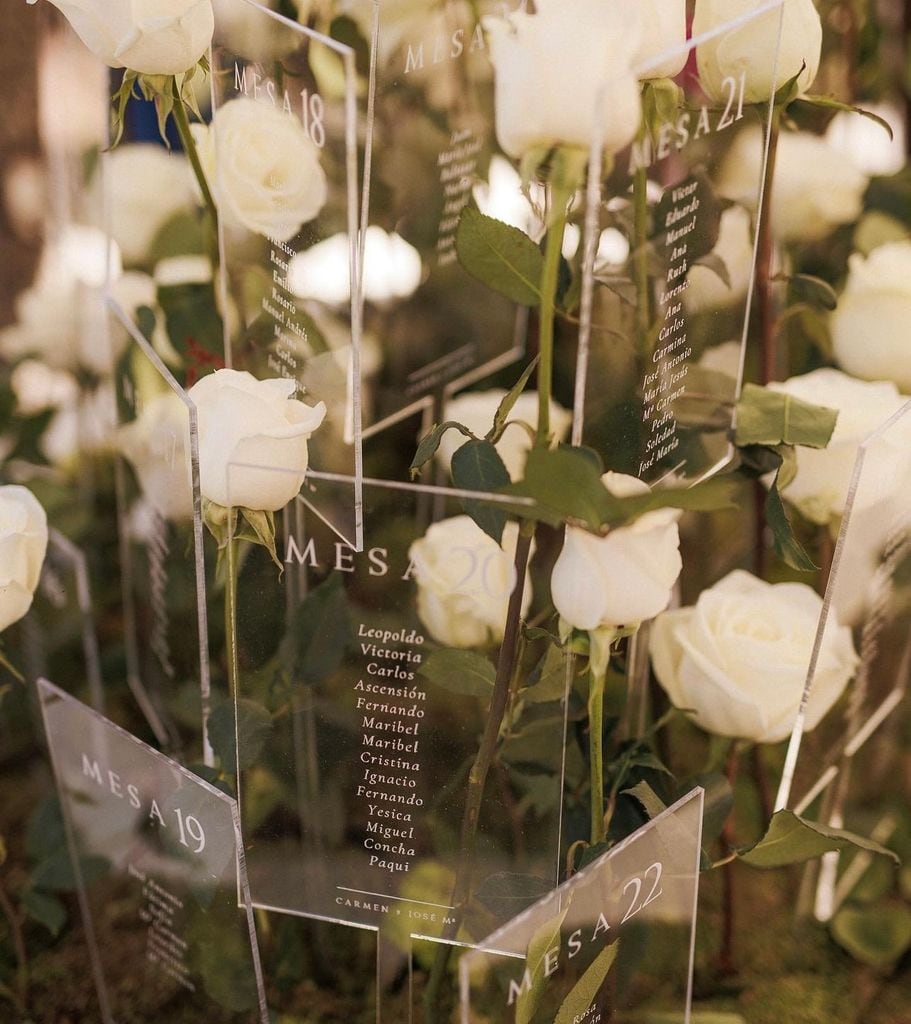 Una de las elecciones más elegantes. Tarjetones transparentes con los nombres de los invitados a contraste rodeados de rosas blancas, flor que representa la inocencia y la pureza. Una de las especies más usadas para inundar ceremonias y banquetes nupciales.