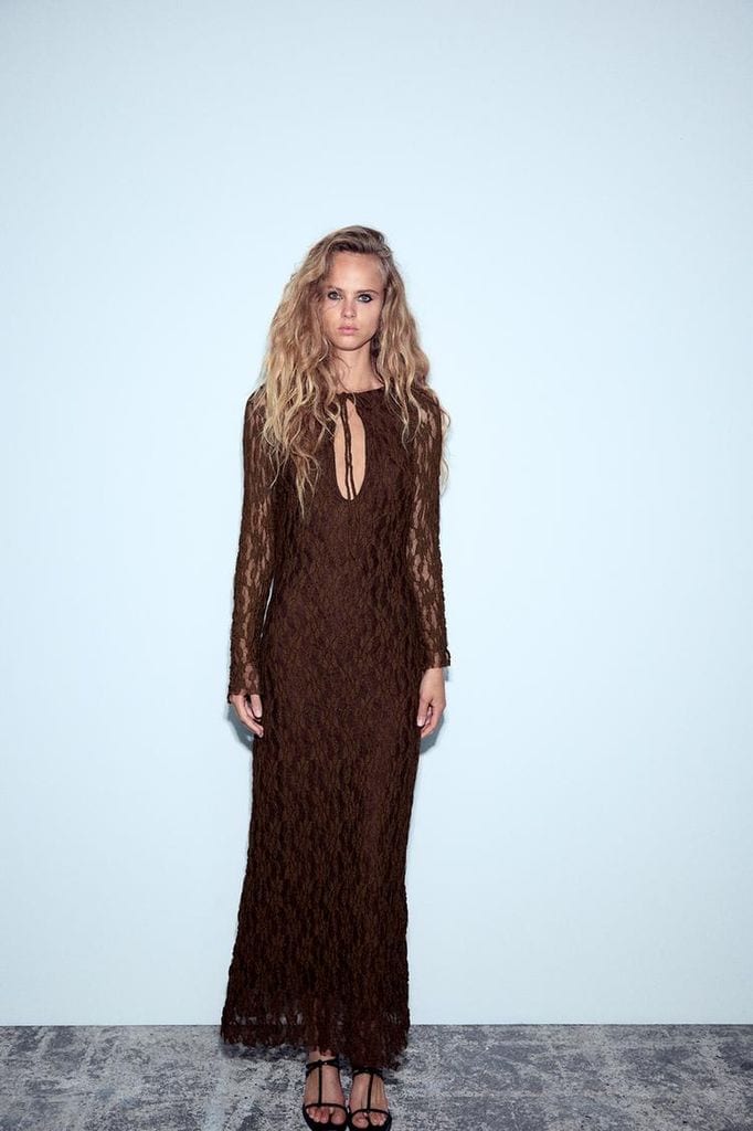 Desde Zara proponen este diseño largo de cuello redondo y escote pico con lazada, el cual incorpora manga larga semitransparente acabada en línea evasé. El toque diferente lo aportan, sin duda, las transparencias del encaje en los brazos. Precio: 49,95 euros.