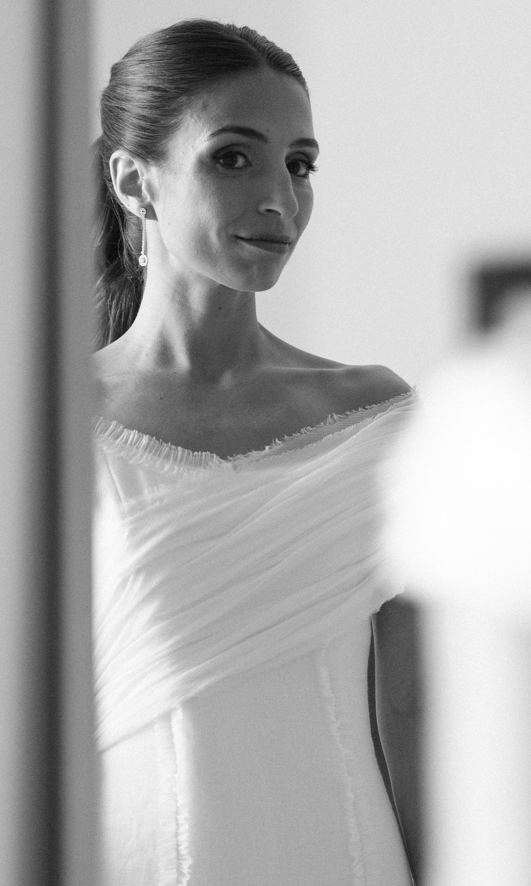 A nuestra tercera protagonista le apetecía muchísimo vivir el momento de creación en primera línea, siempre tuvo claro que quería hacérselo a medida, y al trabajar en el sector de la moda no le faltaron ideas para tratar de imaginarse vestida de blanco. "Desde el principio planteamos una pieza con mucho movimiento usando tejidos como la gasa o la bambula. Algo fresco y vaporoso, muy del rollo ibicenco, hasta que Guille, (el diseñador), me planteó mezclarlo con lino, ¡me encantó, no podía adaptarse más a Mallorca!", recuerda emocionada.