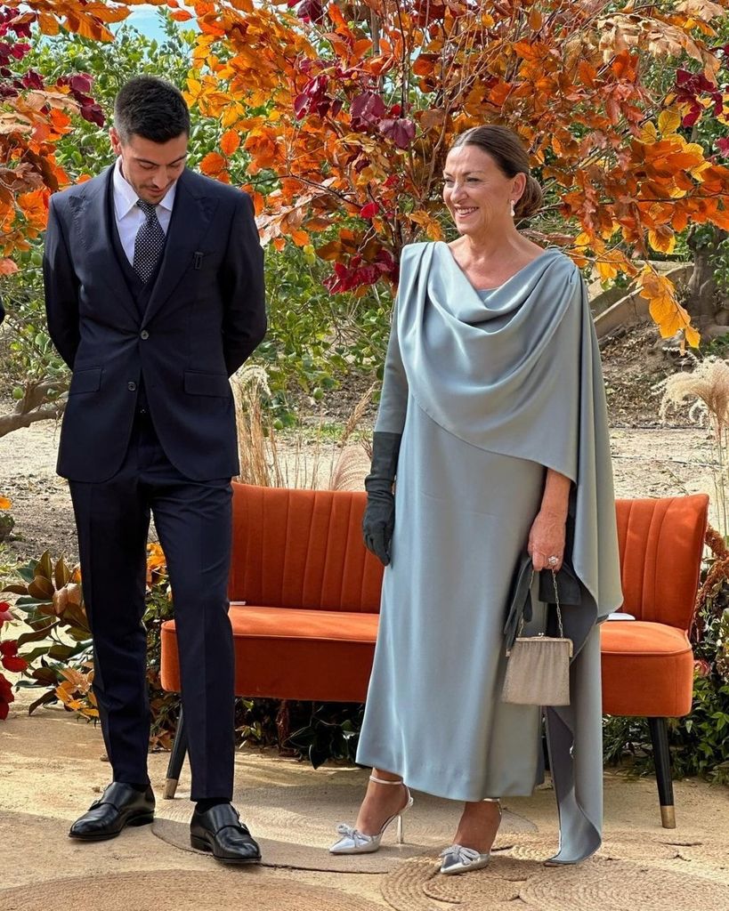Montse Nieto firmaba este vestido de madrina que en los últimos años ha sido todo un fenómeno en las redes sociales. El diseño, en un azul suave, era de estilo fluido y, por tanto, muy cómodo y llevaba una capa asimétrica del mismo tejido, para completar. Esta madre del novio recurrió, aparte, a una mantilla negra de chantilly, a unas joyas sencillas y discretas y a unos polivalentes guantes en beis.