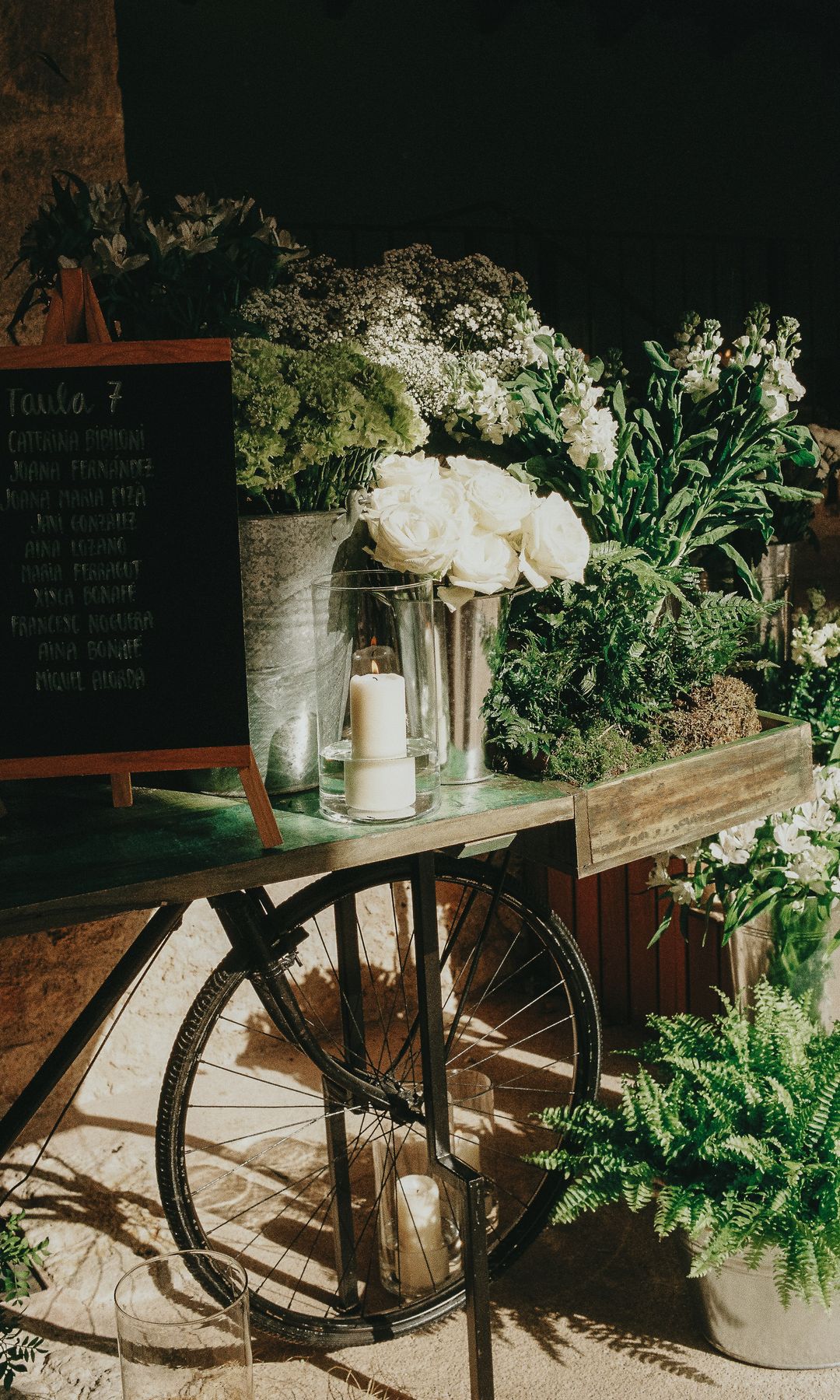 La decoración tuvo un papel muy especial en la boda. Y no solo en la iglesia, también en la finca. "La finca cuenta con una brutal pared de enredadera verde; la combinamos mesas Bistró con mantelería de cuadros verdes de vichy, con mobiliario de bambú, jarrones de Frida Kahlo, jarrones con motivos frutales, etc. Otro de los éxitos rotundos fue la estación floral de coronas/diademas para las invitadas. Es Brot preparó más de 80 coronas/diademas con flor preservada y todo tipo de colores, fue una pasada como cada invitada encontraba la corona que combinaba más con su vestido, estaban todas guapísimas", nos cuenta la novia.
