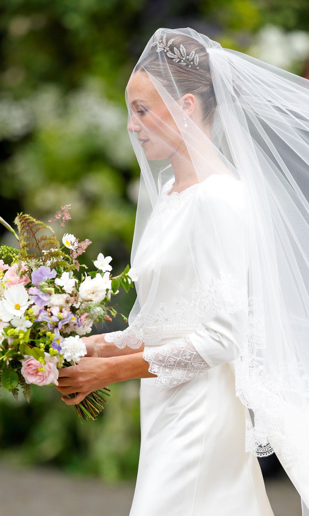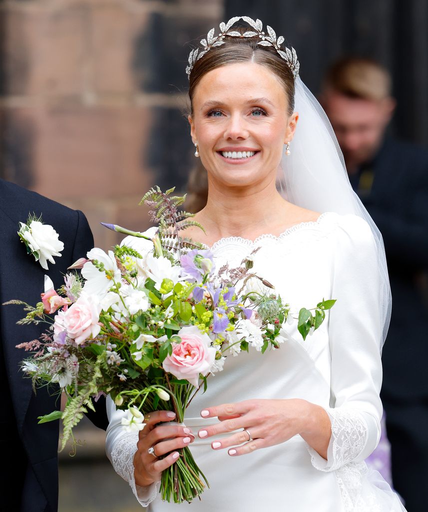 En cuanto al ramo, quiso seguir la tradición de otras novias como Kate Middleton o Meghan Markle llevando un bouquet de flores recogidas en unos jardines cercanos apenas unas horas antes del enlace. En su caso, en lugar de optar por un diseño en tonos blancos y verdes, eligió una combinación con notas de color de hierba de pradera, margaritas ojo de buey, iris, rosas, clemátides, naranjas, escabiosas, guisantes de olor, astrantias y 'amor en la niebla'.