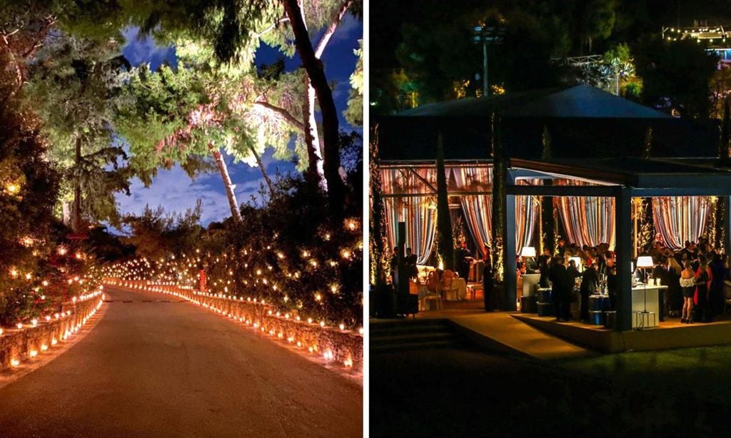 Después de la ceremonia religiosa, los novios ofrecieron un banquete en la Asociación Nacional de Gimnasia , un complejo deportivo a los pies de la Acrópolis y con vistas al Partenón. Ubicado en el centro de la capital, en el histórico barrio de Pangrati, el recinto está rodeado por el Jardín Nacional de Atenas y el Záppeion y por las colinas cubiertas de pinos de Ardettos y Agra. Se trata de un sitio histórico, el lugar donde se organizaron los primeros Juegos Olímpicos de la era moderna, en 1896. Se encuentra junto al legendario Estadio Panathinaikó, también conocido como el Kallimármaro, reconstruido a partir de los restos de un antiguo estadio griego y el único en el mundo hecho enteramente de mármol blanco del monte Pentélico. Se levantaron enormes carpas decoradas en tonos azules y blancos, los colores de la bandera griega. Las mesas, montadas al estilo imperial, fueron decoradas fastuosamente con cientos de candelabros y velas, abundantes arreglos florales y todo tipo de motivos frutales.
