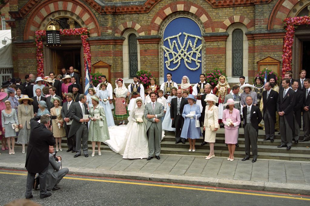 Su boda fue un auténtico cónclave de royals y la novia lució espectacular y como una auténtica princesa con su vestido de Valentino, un velo de cuatro metros y la delicada tiara Corsario, que pertenece al joyero de la Casa Real griega. Sin duda, fue un evento a la altura del estatus de un heredero y aunque en el exilio, los novios congregaron a 1.300 invitados. Exceptuando el enlace de Isabel II y el príncipe Felipe de Edimburgo, ningún otro 'sí, quiero' celebrado en la capital del Támesis tuvo tantos reyes y príncipes. La reina de Inglaterra, todos los príncipes herederos de la época, la Familia Real española al completo, la reina Margarita, los reyes de Suecia y un largo etcétera de ilustres invitados la convirtieron en una de las grandes bodas reales de mediados de los años 90.