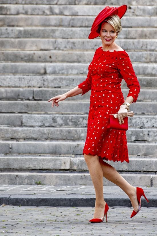 La esposa del rey eligió para la ocasión un total look en rojo troquelado de Natan con flores bordadas, cuello barco y manga francesa. Combinado con zapatos, cartera y sombrero a juego, este último perteneciente a la colección Couture de la Casa Fabienne Delvigne, fabricado con fibras naturales que le confería un aire de lo más elegante. Por su parte, la primogénita de Felipe y Matilde de Bélgica destacó con un vestido midi negro con estampado floral de manga corta y con un lazo rojo a la cintura. En cuanto a Gabriel y Emmanuel, lucieron sendos trajes azules. La pequeña, Éléonore, lució un vestido de manga corta en color amarillo.