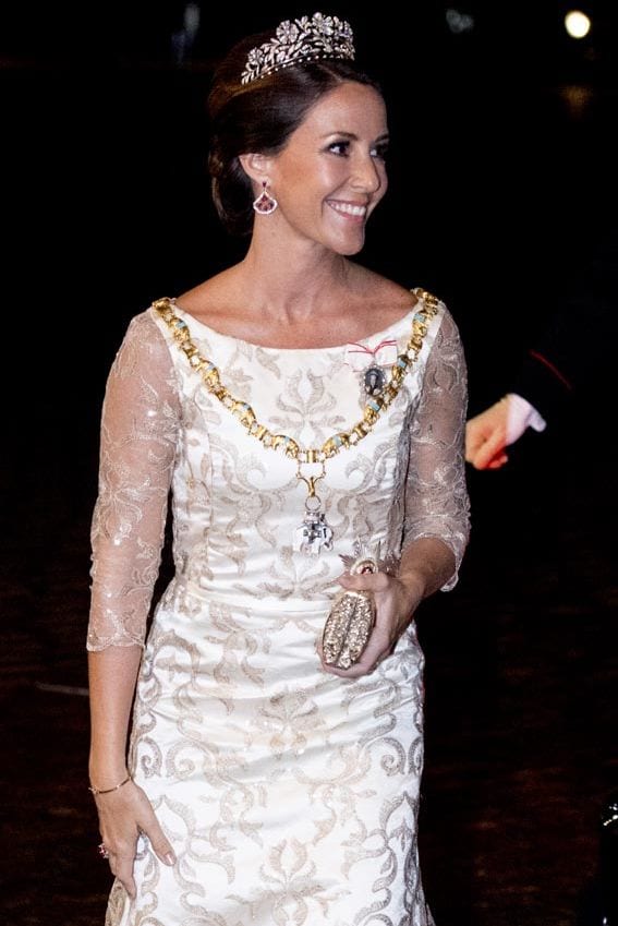 Rivalizando con la princesa Mary, su cuñada Marie escogió el tono marfil para su vestido de Rikke Gudnitz, que tenía un sobrevestido de encaje con las mangas transparentes. Fiel a su estilo y preferencias optó por la tiara floral de diamantes, que perteneció a la princesa Dagmar y luego fue heredada por su sobrino, el rey Federico IX que la entregó a la reina Margarita. Es una pieza que la princesa Marie llevó el día de su boda con el príncipe Joaquín, en 2008, y que en esta ocasión combinó con unos pendientes en forma de abanico invertido. Todos los miembros de la familia llevaban el collar de la Orden del Elefante, la máxima distinción que concede el país.