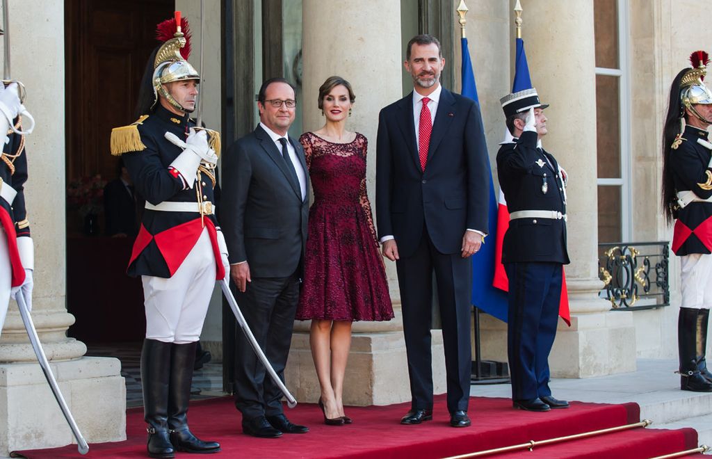 Tal y como mandaba el protocolo de la noche –en las invitaciones se precisaba que las mujeres deben ir con vestido de cóctel, por lo tanto, no entra en el 'dress code' el uso de diadema o tiara-, doña Letizia eligió optó por vestir la noche parisina de Felipe Varela. Con un vestido en tul ‘Marsala’ bordado con hilo y cristal borgoña, un 'clutch' de cristal negro, de la misma firma, y zapatos del color del vestido. En cuanto al peinado la Reina ha vuelto a innovar dando un nuevo aspecto a su corte ‘bob’, con unas ondas al agua, de un estilo años veinte, que iban en sintonía con un maquillaje en el que destacaban los labios pintados exactamente del color del vestido