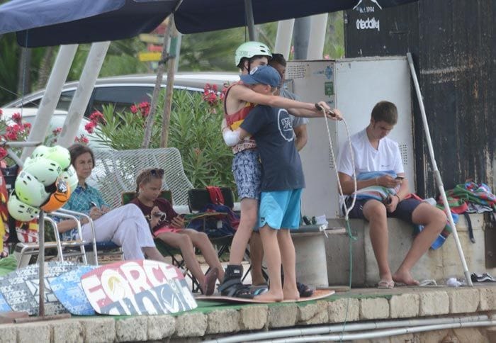 Se pudo ver la pericia que demostraron en el agua Felipe, hijo mayor de la infanta Elena y que ha estado estas pasadas semanas en Ibiza y Marbella con Mar Torres-Fontes, y Pablo, hijo de la infanta Cristina, que surcaron el agua mientras Juan Valentín, Irene y Miguel, que tiene un brazo vendado, los otros hijos de la infanta Cristina, les observaban desde el muelle junto a su abuela. Miguel, que no pudo practicar el mismo deporte que su hermano y primo debido a su brazo lesionado, despidió a su hermano Pablo con un abrazo antes de que este se lanzara al agua para demostrar lo bien que se le da este deporte. Miguel se tuvo que conformar esta vez con navegar a bordo de una tabla de surf.