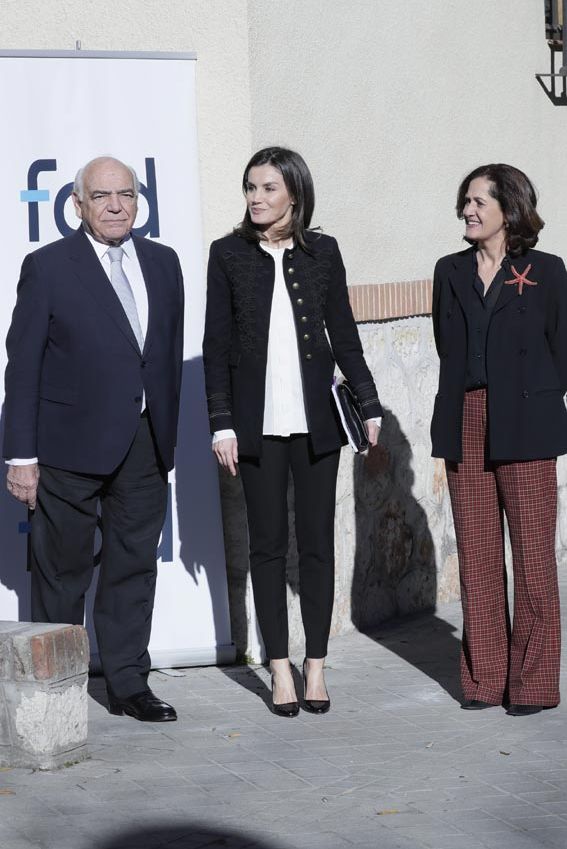 La Reina asistió a la reunión con un traje pantalón, en tono negro y con la chaqueta de inspiración militar, combinado con una camisa blanca, un conjunto al que añadió unos zapatos de fino tacón del mismo tono oscuro. Doña Letizia está muy involucrada en la labor que desarrolla esta institución, a cuyas sesiones de trabajo acude cuando así es necesario desde que cogió el relevo de la reina Sofía en el año 2015. El pasado diciembre, estuvo en el acto de presentación de la nueva campaña de sensibilización social que, por primera vez en la historia de la FAD, se desarrolla en el ámbito digital y está especialmente dirigida a los jóvenes.