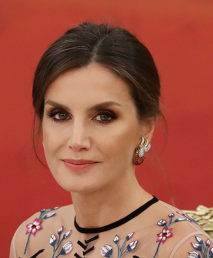 El primer día de su gira por el país asiático ha terminado con una cena oficial que ha ofrecido el presidente de la República y la primera dama. Para esta ocasión, la esposa del Monarca ha elegido un vestido de transparencias y bordados florales de Temperley London