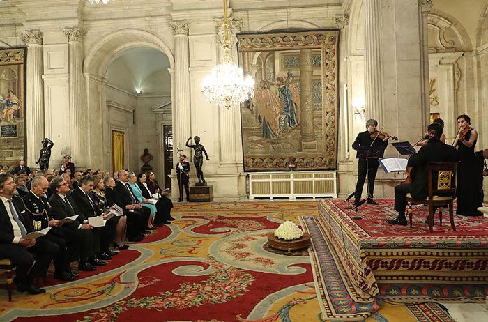 Luego, disfrutaron del concierto, en el que el cuarteto de cuerdas Ensemble Praeteritum interpretó piezas del compositor austríaco de origen judío Arnold Schönberg y de Felix Mendelssohn, cuyas obras fueron prohibidas por el régimen nazi. También se recordó la figura de Fritz Kreisler, otro músico perseguido por el nazismo, interpretándose su popular Liebesleid. Doña Sofía y la princesa Irene, dos auténticas melómanas, aplaudieron con entusiasmo la interpretación del cuarteto.