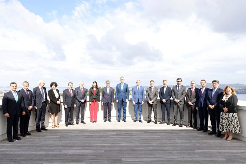 Tras recorrer la nueva Ciudad de la Justicia, don Felipe ha recibido en audiencia a los presidentes de los Tribunales Superiores de Justicia (TSJ), el órgano cúspide del poder judicial en las comunidades autónomas sin perjuicio de la jurisdicción que corresponde al Tribunal Supremo y de aquellas materias que exijan garantías constitucionales, competencias del Tribunal Constitucional. Los TSJ constan de tres salas (civil y penal, contencioso-administrativo y social). Se componen de un presidente, que lo será también de la sala civil y penal, de los presidentes de sala y de los magistrados que determine la ley para cada una de sus salas. En esta audiencia ha estado acompañado por el presidente del Tribunal Supremo y del Consejo General del Poder Judicial, Carlos Lesmes; el presidente de la Xunta de Galicia, Alfonso Rueda; y la ministra del ramo, Pilar Llop. A su salida de la nueva sede judicial, don Felipe se ha acercado a saludar a los curiosos que esperaban en los adelaños del recinto.