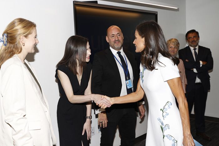 Hemos visto cómo doña Letizia saludaba nada más llegar a los asistentes, para después posar juntos ante los fotógrafos y a continuación mantener la charla que se ha desarrollado en inglés.