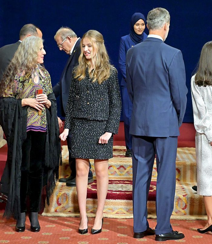 Este breve acto es muy protocolario y ceremonial, pero también da pie a momentos más personales. La Reina, además de saludar a los premiados, ha intercambiado unas palabras con ellos, sobre todo, se ha mostrado muy cercana con Carmen Linares, Juan Moyarga y el periodista polaco Adam Michnik. Una vez finalizada la audiencia, los Reyes y sus hijas han protagonizado una foto de familia y ha sido entonces cuando hemos podido ver a la princesa de Asturias conversando con la artista María Pagés.