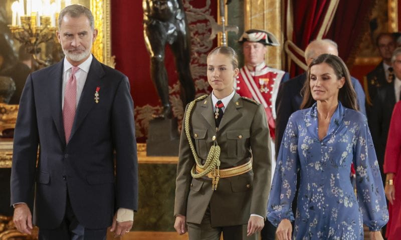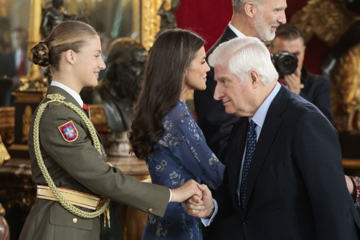 Al entrar en el Salón del Trono, a Leonor se la ha visto cómoda y segura en una recepción en la que estaba arropada por su entorno. A diferencia de en el desfile, no se ha colocado a la derecha de su padre, sino al lado de su madre, pero la conexión padre e hija en la esfera institucional y personal ha sido más que patente. Nadie mejor que el monarca sabe el destino que le espera a su primogénita y conoce de primera mano las vivencias que ella está experimentando en la Academia General Militar de Zaragoza, por la que él también pasó.