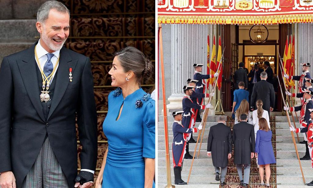 Tras saludar a las autoridades presentes en el salón de los Pasos Perdidos —con cambio de posiciones, Leonor entre la Reina y su hermana, Sofía (a su derecha)—, la Familia Real se dirigió a la Puerta de los Leones para, desde la escalinata del palacio de las Cortes, presidir el desfile por la carrera de San Jerónimo del Batallón de Honores de la Fuerzas Armadas y la Guardia Civil.
