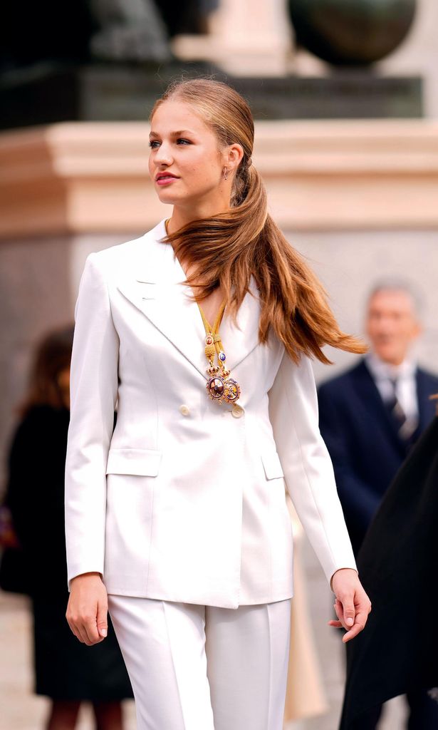 En uno de los días más importantes en la vida de Leonor, se desvelaba por fin su estilismo. Sencillo y sobrio como el mismo acto, pero rompedor. Frente al vestido largo, un dos piezas masculino marcando los nuevos tiempos, pero sin olvidar la tradición ni su dinastía, que resumió con la insignia del Toisón de Oro que le impuso Felipe VI en 2018.